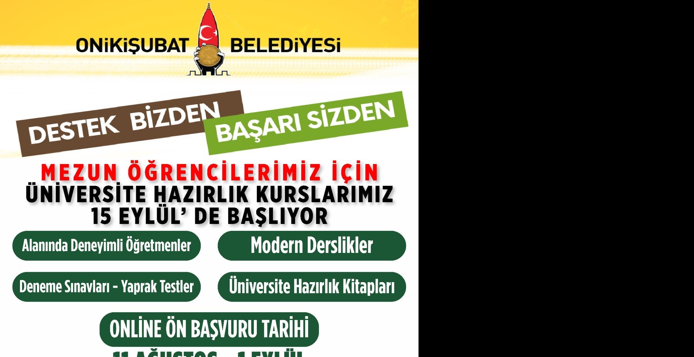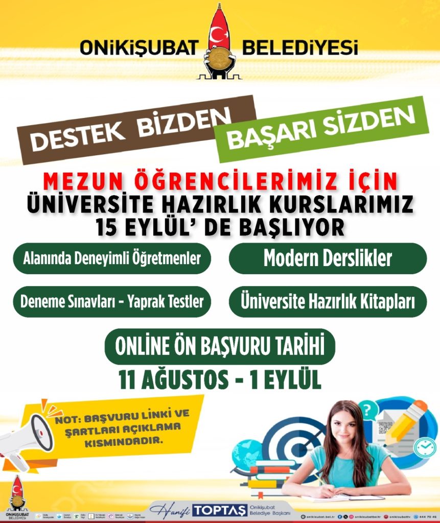 Eğitime verdiği önemi her fırsatta ortaya koyan Onikişubat Belediyesi, üniversite hayali kuran mezun öğrenciler için ücretsiz üniversite hazırlık kurslarını yeni dönemde de sürdürüyor. Geçtiğimiz yıllarda birçok öğrenciyi hayallerindeki üniversiteye taşıyan bu önemli kurs için ön başvurular 11 Ağustos – 1 Eylül tarihleri arasında alınacak, kurs ise 15 Eylül’de başlayacak.